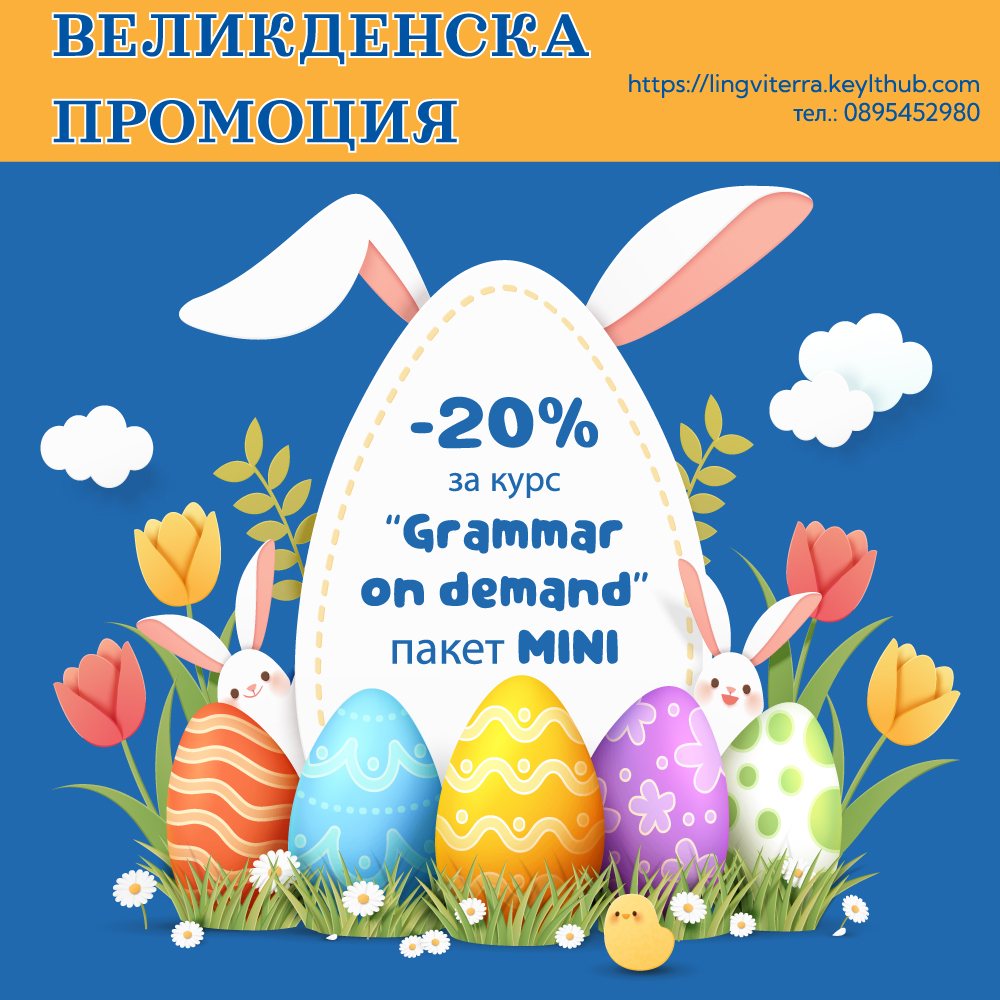 Само през април можете да закупите пакет MINI на курса „Grammar on demand“ на промоционална цена с 20% отстъпка и да го използвате в рамките на един месец от датата на закупуване.